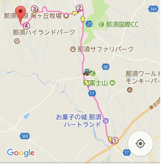 ①那須IC下車し県道17号(那須街道)「板室・那須湯本」方面へ右折→8km程直進